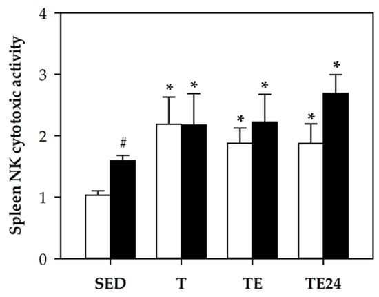 Spleen NK cytotoxic activity (number of dead target cells per 100 effector cells). The non-supplemented groups are represented by white bars and the hesperidin-supplemented groups by black bars. SED = sedentary groups; T = trained groups; TE = T groups with an additional exhaustion test; TE24 = TE groups 24 h after the exhaustion test. Data are expressed as mean ± SEM (n = 8). Statistical difference (Mann–Whitney U test): * p < 0.05 vs. SED group; # significant differences between non-supplemented and the counterpart hesperidin-supplemented group (p < 0.05).