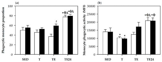 Phagocytic monocyte proportion (a) and monocyte phagocytic activity expressed as mean fluorescence intensity (MFI) (b). The non-supplemented groups are represented by white bars and the hesperidin-supplemented groups by black bars. SED = sedentary groups; T = trained groups; TE = T groups with an additional exhaustion test; TE24 = TE groups 24 h after the exhaustion test. Data are expressed as mean ± SEM (n = 7–8). Statistical difference (Mann–Whitney U test): * p < 0.05 vs. SED group; ϕ p < 0.05 vs. T group; λ p < 0.05 vs. TE group; # significant differences between non-supplemented and the counterpart hesperidin-supplemented group (p < 0.05).