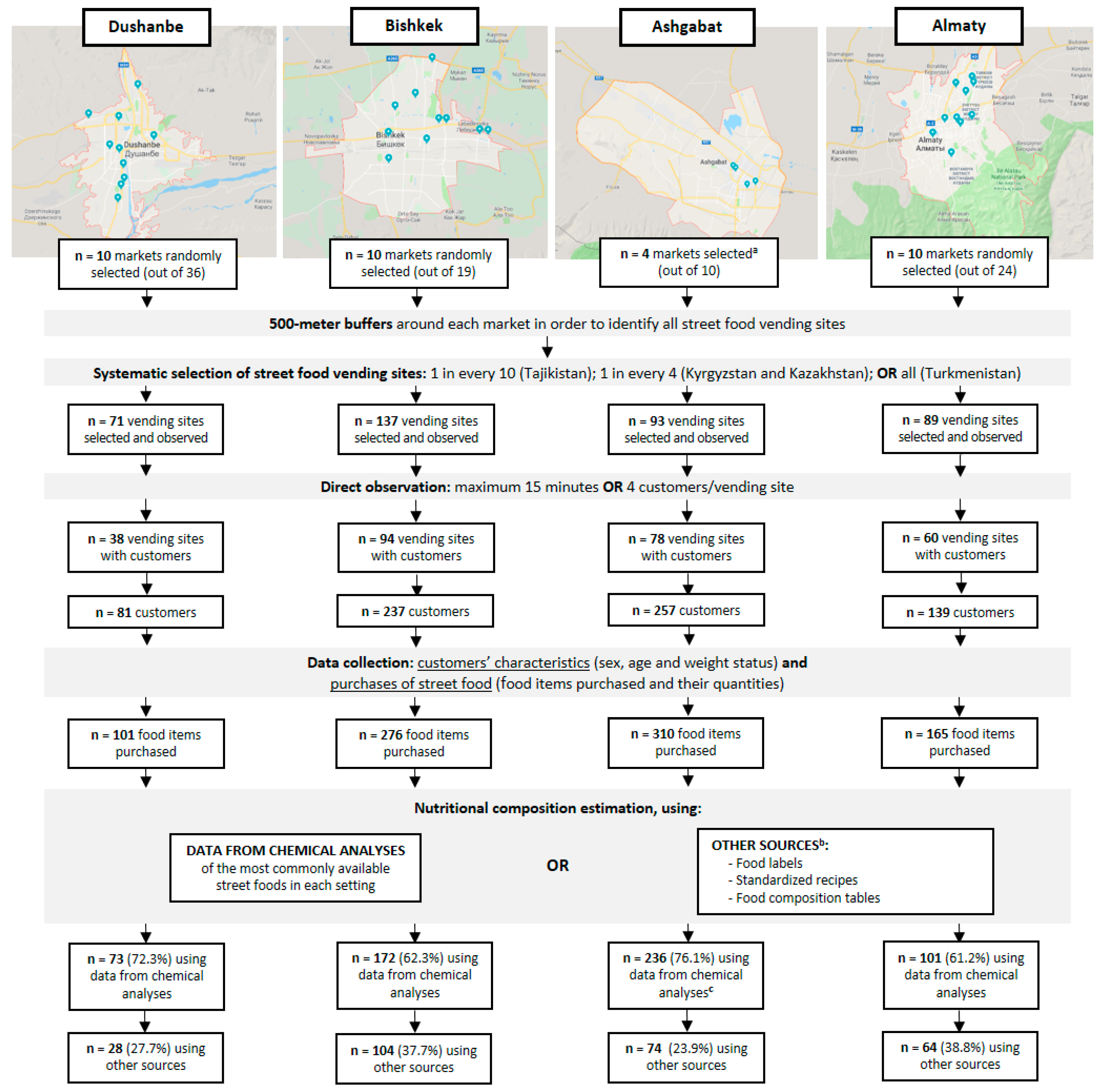 Sousa, S.; Morais, I.L.d.; Albuquerque, G.; Gelormini, M.; Casal, S.; Pinho, O.; Motta, C.; Damasceno, A.; Moreira, P.; Breda, J.; et al. A Cross-Sectional Study of the Street Foods Purchased by Customers in Urban Areas of Central Asia. Nutrients 2021, 13, 3651. https://doi.org/10.3390/nu13103651