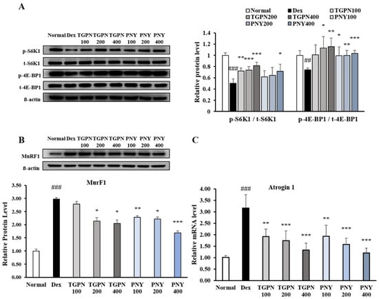 Effect of TGPN and PNY on expression associated with protein synthesis and degradation in C2C12 myotubes. C2C12 myotubes were co-treated with 50 μM dexamethasone and various concentrations (100, 200, 400 μg/mL) of TGPN and PNY on day 7 of differentiation for 48 h. The relative expression levels of (A) S6K1 and 4E-BP1, (B) MuRF1, (C) Atrogin-1. The protein expression levels were normalized to the β-actin. The mRNA expression level was normalized to GAPDH. The results are presented as mean ± SD. ## p < 0.01, ### p < 0.001 versus normal, * p < 0.05, ** p < 0.01, *** p < 0.001 versus Dex.