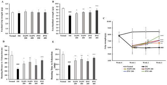 Effect of TGPN and PNY on muscle function in hindlimb immobilization-induced muscle atrophy mice. Mice were subjected to hindlimb immobilization for one week, except for the normal group, and then administered with TGPN 200, 400 mg/kg, or PNY 200, 400 mg/kg for two weeks with continuous immobilization. (A) The forelimbs grip strength. (B) The fore/hindlimbs grip strength. (C) The grip strengths curve. The grip strengths were normalized to the bodyweight. (D) Running distance on the treadmill. (E) Running time on the treadmill. Data are presented as the mean ± SD. ### p < 0.001 versus normal, * p < 0.05, ** p < 0.01, *** p < 0.001 versus IM.