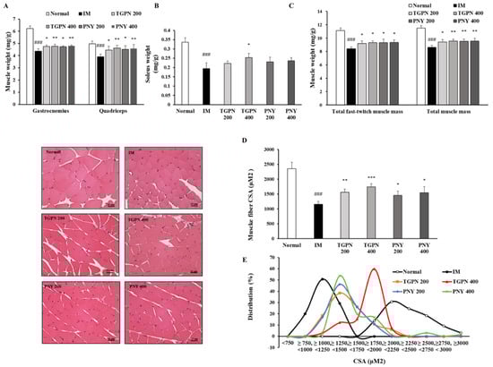 Various models of sarcopenia have been previously used, such as denervation, cast immobilization, and hindlimb unloading []. Previous studies have shown that hindlimb-immobilization significantly reduced muscle mass, exercise endurance, grip strength, and muscle fiber CSA [,,]. Our study showed similar changes, and, thus, we verified the pathogenesis of sarcopenia by hindlimb immobilization. At the end of the experiment, the bodyweight of the IM group was reduced by approximately 6% compared with the normal group, indicating that muscle wasting may have been caused by immobilization (Supplementary Figure S1). However, the bodyweight of TGPN and PNY administration groups showed a tendency to increase compared to the IM group, and both the 400 mg/kg TGPN and PNY administration groups showed increased bodyweight, similar to that of the normal group. In terms of total muscle mass, the TGPN 400 and PNY 400 administration groups showed a significant increase of 11% compared to the IM group, and the increased muscle mass may be contributed to the increase of bodyweight. This result can be proof that muscle loss by immobilization was recovered by TGPN and PNY administration.