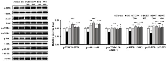 The gastrocnemius is the largest part of the three muscles that make up the hindlimb, and the gastrocnemius muscle has a high capacity for both force and power production. Therefore, we studied the molecular mechanism using the gastrocnemius muscle. Activation of the PI3K/Akt pathway increases protein turnover through simultaneous regulation of protein anabolism and catabolism. First, the PI3K/Akt/mTORc1 pathway regulates muscle protein synthesis []. The phosphorylation ratio of PI3K and Akt was significantly decreased during IM, which was followed by a significantly reduced phosphorylation ratio of mTOR, S6K1, and 4E-BP1. Administration of TGPN and PNY dose-dependently alleviated these parameters, and restored normal levels. In terms of protein synthesis, the TGPN groups showed superior results to that of the PNY groups, consistent with our in vitro results (Figure 6).