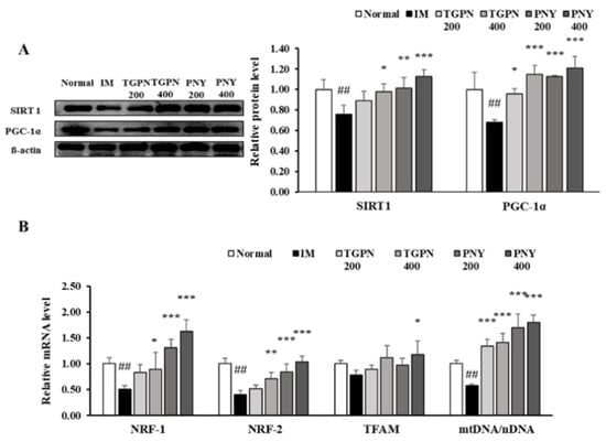 In this study, TGPN and PNY affected the grip strength and muscular endurance test, hence, we determined whether any association with mitochondrial biogenesis exists. NAD-dependent deacetylase sirtuin-1 (SIRT1) activates PGC-1α by deacetylation of lysine residues, and PGC-1α regulates transcription factor NRF-1/2 and TFAM. Consequently, activation of SIRT1/PGC-1α signaling enhances mitochondrial biogenesis. In the IM group, the protein expression of SIRT1 and PGC-1α levels were significantly decreased compared to those in the normal group. TGPN and PNY administration significantly increased the downregulated protein expression of SIRT1 and PGC-1α; notably, the expression level of both markers in the PNY 400 group was restored to normal level (Figure 8A). Subsequently, the mRNA expression of TFAM, NRF-1, and NRF-2, which related to mitochondrial biogenesis, were decreased in the IM group compared to the normal group. These decreases were alleviated in the TGPN and PNY groups. Consistently, relative mtDNA content was significantly decreased in the IM group versus the normal group. TGPN and PNY administration, however, dose-dependently increased mtDNA content (Figure 8B). Overall, these results suggest that TGPN and PNY simulate mitochondrial metabolism and SIRT1/PGC-1α signaling.