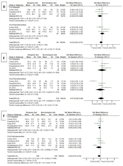 Three studies were analyzed for triglyceride (TG) levels. For subgroup analysis from Figure 3D, the test for subgroup differences indicated that there was no statistically significant effect (p = 0.16), suggesting that TG levels in pre- and post-interventions did not modify the effect of KD in comparison to non-KD groups. The pooled analysis used a fixed effect model to test for TG showed baseline subgroup [SMD (95% CI) = −0.34 (−0.76, 0.08) and [SMD (95% CI) = 0.09 (−0.33, 0.51) for the post-intervention subgroup. The KD group was favored over non-KD group for baseline study while the non-KD group was favored over the KD group for the post-intervention subgroup and, therefore, the subgroup effect is qualitative. Subgroup differences showed I2 = 50.3% and indicated that the results from all trials included in this analysis were of moderate heterogeneity. Subgroup differences showed no significant effect between the subgroups of the interventions (p = 0.16).