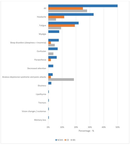 In particular, neuropsychiatric disorders are often referred to and greatly impact the quality of life of the patients suffering from them. Ataxia and neuropathy are the disorders most frequently reported in untreated CD [], with several studies and case reports describing an improvement in neurological symptoms after the start of a gluten-free diet (GFD) []. By contrast, depression, anxiety, and somatization disorders, together with headache and fatigue, are commonly referred by patients with IBS [,].