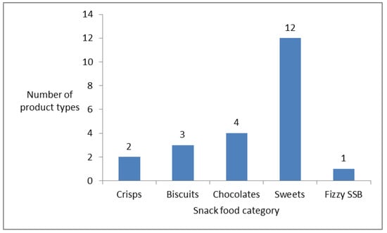 Total number of product types available for each snack food category at the school tuckshop in the study school.
