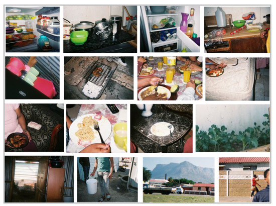 A total of 25 cameras were returned. Reasons for drop-out included damage to the camera (n = 1), late camera return (n = 5) or absence on interview day (n = 4). Photographs were examined by M.S. and N.P. and a maximum of five photos that reflected each participant’s home and community food environment were selected for discussion in an individual interview. Semi-structured interviews were conducted with learners at a school venue and audio recorded by N.P. within two weeks after the return of the cameras. The semi-structured interviews were an adapted version of the SHOWED methodology []. The SHOWED method involves structuring Photovoice interviews by posing a series of questions about the participant’s photos (in this study, three–five questions), and were framed to elicit a descriptive response, e.g., “What kind of meal is this?” “How often do you eat these types of foods?” “Where do you or your family buy this?” Additionally, and guided by N.P., learners discussed how their photos related to their diet and food availability and accessibility in their environment []. A total of 15 interviews were conducted by N.P. and took place in the last week before the school break. The reason for drop-out was absence from school on the designated interview day. Each learner received a small gift of stationary upon return of the cameras and a healthy snack at the conclusion of the interviews.