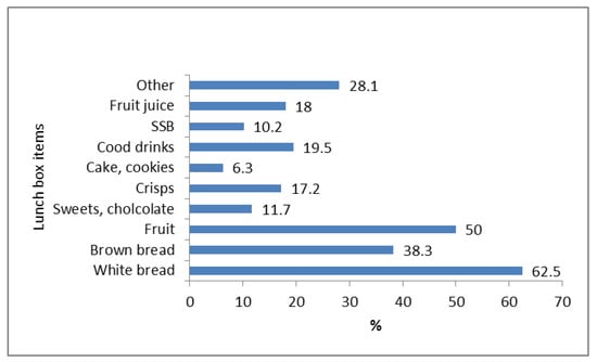 Bread meals were defined as meals that included bread as the key item, e.g., sandwiches, that were either taken in lunchboxes or eaten at any time during the day (Figure 6). White bread was the most commonly mentioned type of bread eaten, with polony (highly processed luncheon meat made from pork, beef or chicken) as the most frequently mentioned filling. When a learner was asked why they eat white bread they replied, ‘I like it because it doesn’t make me full and I don’t want to be full in school’. When asked why they did not like to be full, they replied, ‘Because I might get tired or I might sleep’.