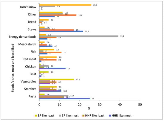 Statistica version 13.2 was used for analysis of the household and learner data. Frequencies were tallied for categorical variables and the mean (standard deviation) (SD) or median (inter quartile range) (IQR) for continuous variables was calculated depending on the distribution of the data according to the Schapiro Wilk test. Responses to the free text questions were categorized and collapsed for reporting. This resulted in 13 categories for food items/dishes most liked and least liked. These categories included: pasta dishes; starches (maize porridge, rice and cereals); vegetables; fruit; chicken; red meat; fish; meat-starch dish; energy dense dishes/foods (fried chicken, burgers, pizza and meat pies); stews; bread and topping; other (chocolate, pudding, cake, jam, crisps, dairy, legumes; organ meat, eggs; soup; proportion mentioned <4% per item); do not know. The six categories for favourite snack/drink included: sugar sweetened beverages (SSBs) (mentioned with or without an unhealthy snack); salty snacks (crisps and biscuits if not mentioned with a SSB); sweet snacks (sweets, chocolate, cake, biscuits if not mentioned with a SSB); healthy snacks (yoghurt, fruit and popcorn); other (chicken, take-outs, pies, bread, fruit juice, tea/coffee; proportion mentioned <4% per item); do not know.