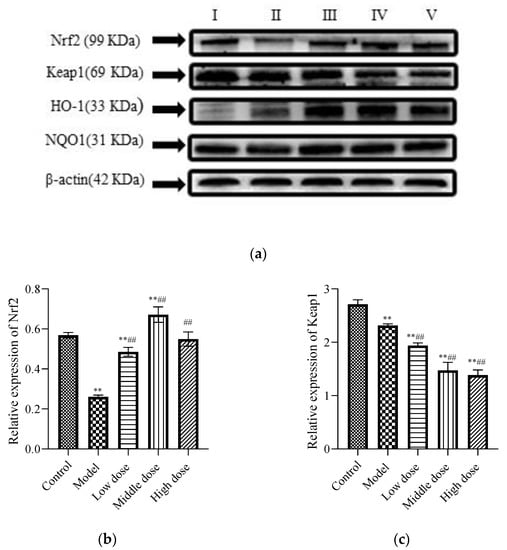 Effects of LBP on Nrf2-related protein expression. I, control; II, model; III, low dose; IV, middle dose; V, high dose. The results are expressed as the mean ± SD, n = 10. * Statistically significant compared to control group, ** p < 0.01. # Statistically significant compared to model group, ## p < 0.01. (a) Western blot analysis of proteins related to nuclear factor erythroid 2-related factor 2 (Nrf2) signaling pathway. (b) Expression of Nrf2; (c) Expression of Kelch-like ECH-associated protein 1 (Keap1); (d) Expression of Oxygenase-1 (HO-1) (e) Expression of NAD(P)H dehydrogenase, quinone 1 (NQO1).