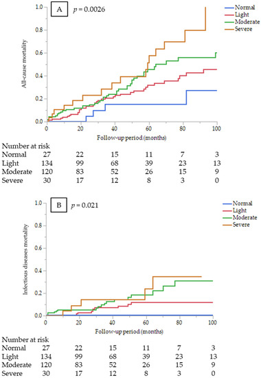 The CONUT score is shown in Supplementary Table S1 [11]. The CONUT score was calculated based on serum albumin concentration, total lymphocyte count, and total cholesterol level. Patients were classified into four nutritional states according to the score depending on their blood test results—namely, normal, light, moderate, and severe. Clinical and laboratory data, including serum levels of albumin, total lymphocyte count, total cholesterol, hemoglobin, and C-reactive protein (CRP), which were measured at dialysis initiation, were obtained from the individual medical records. Body mass index (BMI) was calculated using “dry weight” determined after the dialysis session. We also assessed the cardiothoracic ratio (CTR) before dialysis initiation. Cardiovascular diseases (CVDs) included myocardial infarction, arrhythmia, heart failure, stroke, or sudden death. We also surveyed the number of patients who were referred to a nephrologist less than three months before dialysis initiation as a definition of late referral. We diagnosed comorbidities, such as diabetes mellitus, hypertension, and dyslipidemia, according to the patients’ medical history and medication status. Smoking was defined either as a current smoker or one who had smoked in the past but quit smoking.