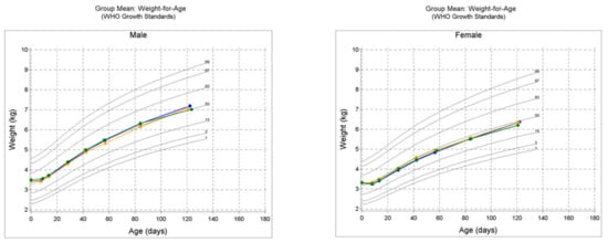 Lastly, the growth charts presented in Figure 3 indicate that the mean weight, length and HC within each sex for the three study groups generally tracked the 50th percentile during the study.