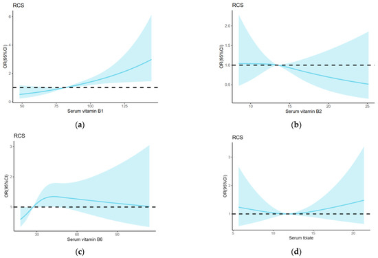 Restricted cubic spline (RCS) regression analysis of group B vitamins including (a) serum vitamin B1, (b) serum vitamin B2, (c) serum vitamin B6, (d) serum folate, and (e) serum vitamin B12 with GDM risk. The median of vitamin B1 86.5 pmol/L, B2 13.5 pmol/L, B6 27.2 pmol/L, folate 11.8 nmol/L and B12 174.8 pmol/L was selected as the reference levels, respectively. The lines indicate estimated ORs, and the light-blue–shaded areas represent 95% CI.