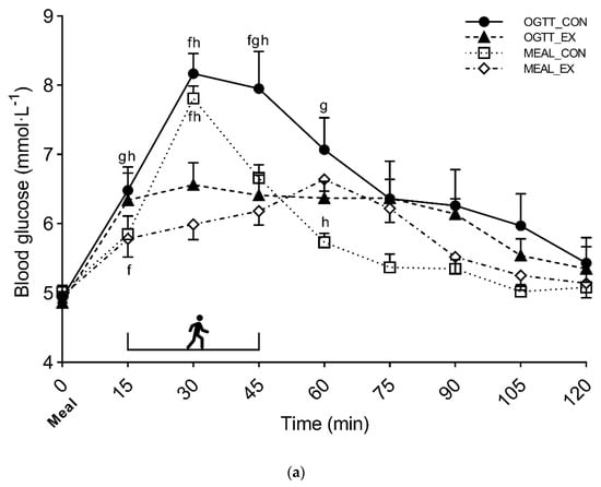 Glycemic time course (a) and time-averaged positive iAUC at 0–60 min (b), 60–120 min (c), and 0–120 min (d) of Study 2. Symbols: e, p < 0.05 vs. OGTT_CON; f, p < 0.05 vs. OGTT_EX; g, p < 0.05 vs. MEAL_CON; and h, p < 0.05 vs. MEAL_EX. The half-box represents the exercise sessions. Values are reported as mean (±SEM).