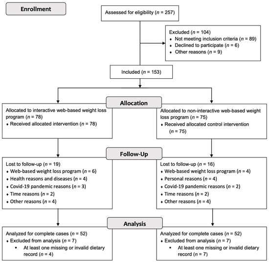 - Kohl, J.; Brame, J.; Centner, C.; Wurst, R.; Fuchs, R.; Sehlbrede, M.; Tinsel, I.; Maiwald, P.; Fichtner, U.A.; Armbruster, C.; et al. Effects of a web-based lifestyle intervention in adults with overweight and obesity on weight loss and cardiometabolic risk factors: A randomized controlled clinical trial. JMIR, 2022; preprints. [Google Scholar]
