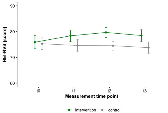 Mean and 95% confidence interval of the HEI-NVS for intervention (n = 78) and control (n = 75) (ITT analysis).