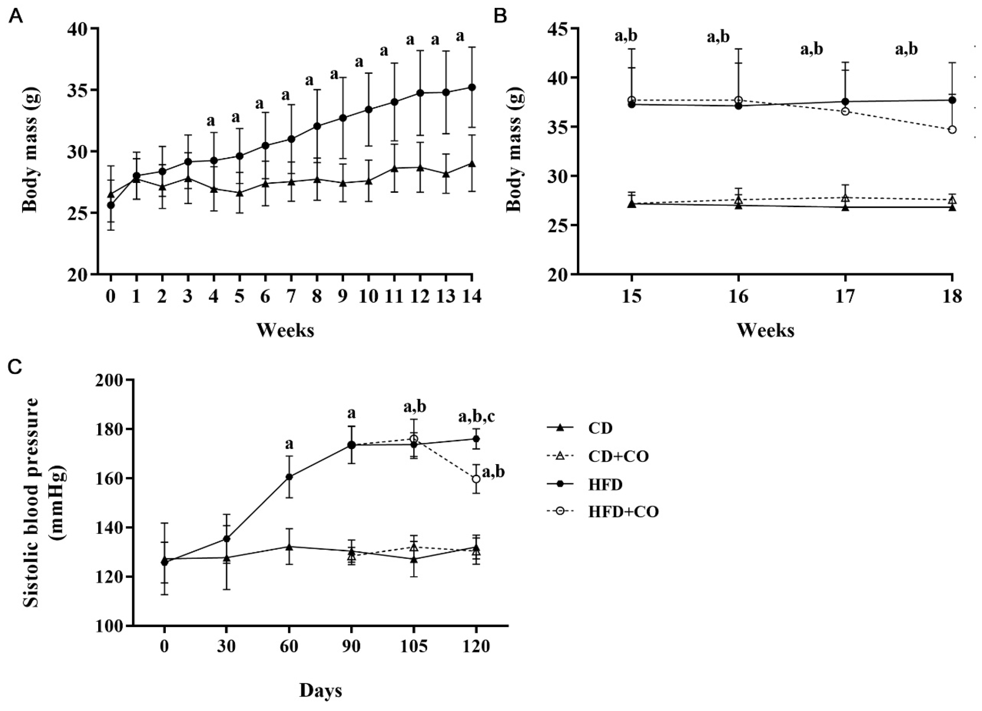 | Total cholesterol | 117 ± 19.5 | 133 ± 8.6 | 187.8 ± 15.5 a,b,c | 150.5 ± 23.9 |