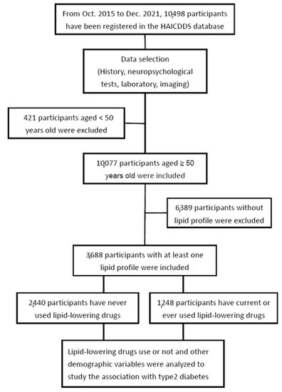 This was a cross-sectional cohort study, and a consecutive series of individuals aged at least 50 years from three centers in Taiwan were analyzed. LLD use was separately investigated to determine the association of TC or LDL-C levels with the prevalence of T2DM. T2DM was diagnosed if fasting blood glucose (FBG) was ≥126 mg/dL among undiagnosed participants or an International Classification of Diseases-10 code of T2DM with a claim for antidiabetic medication. We classified TC and LDL-C into different levels according to the usual recommendation for cholesterol control, particularly LDL-C based on the risks for further cardiovascular (CV) events according to several newer clinical criteria. Therefore, different TC/LDL-C levels were separately analyzed to study their association with diabetes. The flowchart of participant selection is presented in Figure 1.