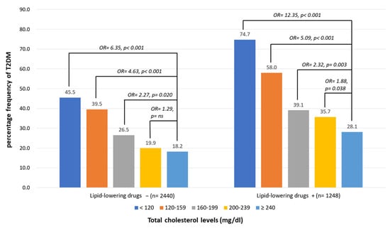 Percentage frequency of type 2 diabetes mellitus (T2DM) according to total cholesterol (TC) levels of participants with or without using lipid-lowering drugs. Multiple logistic regression analysis was adopted for investigating the contribution of TC levels to prevalence of T2DM. Odds ratios (ORs) for different levels compared to the highest (≥240) were adjusted for age, sex, Montreal Cognitive Assessment, Instrumental Activities of Daily Living, triglycerides, cerebrovascular diseases, hypertension, dyslipidemia, coronary artery diseases, congestive heart failure, atherosclerosis, smoking, exercise, and use of antihypertensives, antiplatelets, and anticoagulants. ns: nonsignificance, p > 0.05.