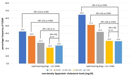 Percentage frequency of T2DM according to low-density-lipoprotein cholesterol (LDL-C) levels of participants with or without using lipid-lowering drugs. Multiple logistic regression analysis was adopted for investigating the contribution of LDL-C levels to prevalence of T2DM. Odds ratios (ORs) for different levels compared to the highest (≥160) were adjusted for age, sex, MoCA, IADL, triglyceride, cerebrovascular diseases, hypertension, dyslipidemia, coronary artery diseases, congestive heart failure, atherosclerosis, smoking, exercise, antihypertensives, lipid-lowering drugs, antiplatelets, and anticoagulants. ns: nonsignificance, p > 0.05.