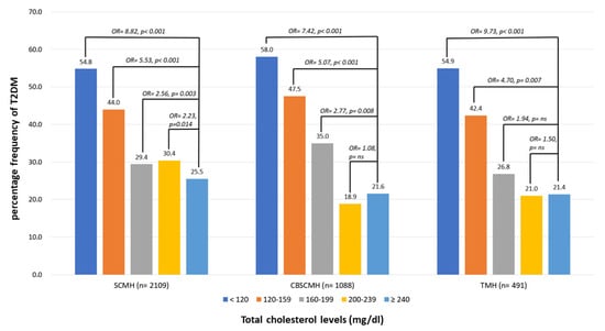Percentage frequency of T2DM according to total cholesterol (TC) levels among participants in different centers. Multiple logistic regression analysis was adopted for investigating the contribution of TC levels to prevalence of T2DM. Odds ratios (ORs) for different levels compared to the highest (≥240) were adjusted for age, sex, MoCA, IADL, triglyceride, cerebrovascular diseases, hypertension, dyslipidemia, coronary artery diseases, congestive heart failure, atherosclerosis, smoking, exercise, antihypertensives, lipid-lowering drugs, antiplatelets, and anticoagulants. ns: nonsignificance, p > 0.05. SCMH: Show Chwan Memorial Hospital; CBSCMH: Chang Bin Show Chwan Memorial Hospital; TMH: Tainan Municipal Hospital.