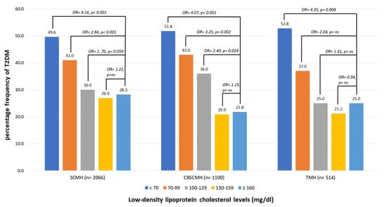 Percentage frequency of T2DM according to low-density lipoprotein cholesterol (LDL-C) levels among participants in different centers. Multiple logistic regression analysis was adopted for investigating the contribution of TC levels to prevalence of T2DM. Odds ratios (ORs) for different levels compared to the highest (≥160) were adjusted for age, sex, MoCA, IADL, triglyceride, cerebrovascular diseases, hypertension, dyslipidemia, coronary artery diseases, congestive heart failure, atherosclerosis, smoking, exercise, antihypertensives, lipid-lowering drugs, antiplatelets, and anticoagulants. ns: nonsignificance, p > 0.05. SCMH: Show Chwan Memorial Hospital; CBSCMH: Chang Bin Show Chwan Memorial Hospital; TMH: Tainan Municipal Hospital.