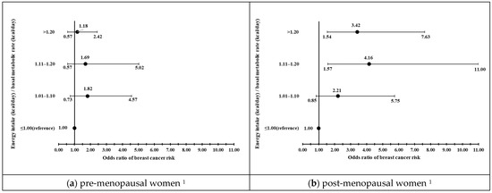 The roles of BMR in BC risk were further explored, and the results showed that total energy intake (TEI)/BMR ratio reaching 1.11–1.20- and >1.20-fold of BMR, respectively, were associated with 4.16- (95% CI = 1.57–11.00) and 3.42-fold (95% CI = 1.54–7.63) increases in BC risks among post-menopausal women. Furthermore, checking the balance between TEI and recommended energy intake for patients with cancer (25 kcal/kg/day × ideal body weight) [26] showed that positive levels were associated with augmented BC risks (OR = 2.22, 95% CI = 1.16–4.26) among post-menopausal women. By contrast, neither TEI/BMR nor the balance between TEI/recommended energy intake for patients with cancer were related to BC risk among pre-menopausal women (Figure 1).