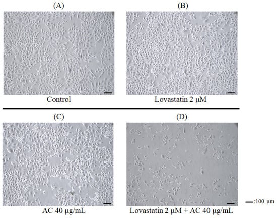 The androgen-refractory prostate cancer PC3 cells were treated with lovastatin and AC extract, individually or in combination, for 72 h. PC3 cells were treated with (A) vehicle as the control, (B) 2 μM lovastatin, (C) 40 μg/mL AC extract, and (D) 2 μM lovastatin plus 40 μg/mL AC extract for 72 h. Bar = 100 μm.