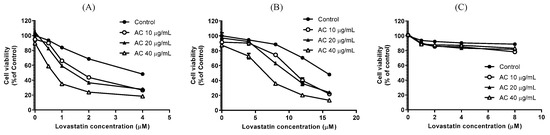 Firstly, a bone-metastatic androgen-refractory human prostate cancer cell line, PC3, was employed to assess the combinatorial effects of lovastatin and AC extract on cellular proliferation. As shown in Figure 1, lovastatin (2 μM) alone (Figure 1B) and AC extract (40 μg/mL) alone (Figure 1C) showed only marginal impacts on the growth of PC3 cells as compared to the untreated control (Figure 1A). Intriguingly, the combination treatment of both agents dramatically reduced the growth of PC3 cells (Figure 1D). The sulforhodamine B colorimetric (SRB) assay was performed to further demonstrate the synergistic anticancer effect of this combination. After 72 h of treatment, AC extract alone exerted only a minimal inhibitory effect at concentrations of 10 to 40 μg/mL, as cell viability largely remained above 90% (Figure 2A). By contrast, lovastatin alone dose-dependently reduced PC3 cell viability to 48.2% of control at a concentration of 4 μM (Figure 2A). Consistent with this observation, the survival inhibition curve of lovastatin was markedly shifted downward in an AC dose-dependent manner (Figure 2A). A similar phenomenon was also observed in another androgen-refractory and bone-metastatic human prostate cancer cell line, DU145 (Figure 2B). Although higher concentrations of lovastatin alone (8 μM and above) were required to suppress the cell viability of DU145 cells compared to PC3 cells, a similar downward shift of the survival inhibition curve was observed when treated in combination with AC extract (Figure 2B). Furthermore, lovastatin and AC extract did not exhibit inhibitory or synergistic effects on the viability of HS68 primary human foreskin fibroblast cells (Figure 2C), suggesting the proliferation-inhibitor effects of the combinatorial treatment modality using lovastatin and AC extract were exclusive to the growth of malignant cells but not normal cells.