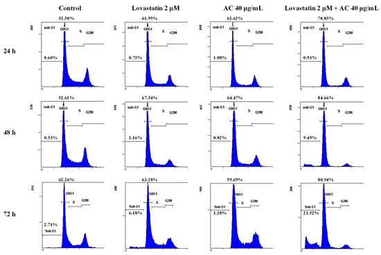 The combined effect of lovastatin and AC extract was further investigated by assessing alterations in the cell cycle of PC3 cells. As shown in Figure 3, apoptosis induction and G1 phase arrest were found in the combined treatment group after 72 h, while the effects of lovastatin (2 μM) and AC extract (40 μg/mL) alone on apoptosis or G1 arrest were insignificant (Figure 3). The cell cycle distributions of these lovastatin and/or AC-treated cells are shown in Table 1. In accordance with the findings shown in Figure 1 and Figure 2A, the sub-G1 arrest population was significantly augmented when PC3 cells were treated with lovastatin (2 μM) and AC (40 μg/mL) at both 48 and 72 h, indicating potent combinatorial efficacy from lovastatin and AC extract.