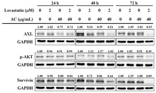 Combination effects of lovastatin and AC extract on aggressiveness-related molecules in PC3 cells. Cells were treated as indicated for 24, 48, and 72 h. Whole-cell lysates were analyzed by Western blot for the proteins of interest. The numbers above the bands indicate the relative densitometric ratios to the bands of loading control (GAPDH). Protein size (kDa): AXL (140), AKT (60), Survivin (16), and GAPDH (35).