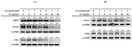 Combination effects of lovastatin and AC extract on the (A) stemness molecules and (B) stemness markers of PC3 cells. Cells were treated as indicated for 72 h. Whole-cell lysates were analyzed by Western blot for the proteins of interest. The numbers above the bands indicate the relative densitometric ratios to the bands of the loading control (GAPDH). Protein size (kDa): SIRT1 (120), Notch1 (125), c-Myc (67), and GAPDH (35).