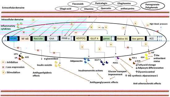 Phenolic molecules derived from PG may modulate PPAR-γ activities [,,,,]. The observed antidiabetic effects resulting from this activation are believed to occur through two distinct pathways, depending on the ligand molecule involved. The first pathway involves selective agonist actions on PPAR-γ (without activatingthe associated PPAR-γ adipogenic factors like DRIP205/TRAP220), ultimately terminating with an improvement in insulin sensitivity []. This approach provides a solution to the weight gain frequently observed with the use of full activator antidiabetic drugs. The second pathway implies a different mechanism and consists of inhibiting PPAR-γ activation to prevent the associated undesirable adipogenesis effects. This activity has been attributed to quercetin, a flavonoid found in PGs [,]. Consequently, PG appears to exert a dual function, with its agonist PPAR-γ activities appearing to be weak in comparison to its PPAR-γ antagonistic actions []. In support of this perspective, Mueller and Jungbauer [] showed that PG fruit extract (standardized to contain 40% EA) exhibited the highest PPAR-γ antagonism among fifty extracts screened for their PPAR-γ antagonistic activity. These findings regarding modulation are in line with those reported in in vitro [,,] and in vivo [,,] studies. Therefore, natural selective PPAR-γ agonists or in contrast, PPAR-γ antagonists, should be targeted as potential alternatives to thiazolidinediones in order to reduce adipose tissue hypertrophy.