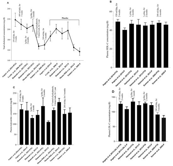 Pomegranate bioeffects on human lipid parameters. (A) Pomegranate consumption effect on total cholesterol [,,,,]. (B) Pomegranate impac on plasma HDL-C concentration [,,]. (C) Pomegranate intake and plasma triglycerides concentration [,,,]. (D) The modulatory effect of pomegranate supplementation on plasma LDL-cholesterol level [,,]. (PTG: Pomegranate treatment group, P: placebo). All values are reported as the mean ± ESM. Pomegranate juice supplementation was also examined for possible atheroprotective effects. According to Burgermeister et al., PG juice products may modulate paraoxonase-2 (PON 2) activities through pathways dependent on PPAR-γ []. After one year of supplementation, it may be effective in increasing plasma paraoxonase activity and serum total antioxidant status by 83% and 130%, respectively []. Moreover, pomegranate intake may ameliorate lipid profile by reducing LDL-cholesterol and triglyceride levels []. PG juice treatment could also improve HDL-associated lactonase, paraoxonase-1 as well as arylesterase activities, when compared to the unsupplemented group [,]. This last finding is fundamentally importat because the enzymatic stability and biological activities of PON 1 improve when this enzyme is bound to HDL. Additionally, this preparation modulates paraoxonase-2 activity through PPAR-γ-related signaling cascades []. In in vivo experiments using apolipoprotein E-deficient mice, it was shown that when this product is added to the diet, it can increase macrophage cholesterol efflux and protect LDL against oxidative alterations [], an initiating event and a crucial step in the atherosclerosis development. These bioprotective effects had been illustrated by attenuating LDL oxidation, macrophage cholesterol biosynthesis reduction [], and redox-sensitive gene inactivation [].