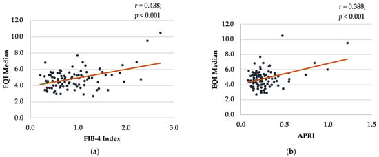 The EQI Median had a moderate positive correlation with the FIB-4 index (r = 0.438; p < 0.001) and a weak positive correlation with the APRI (r = 0.388; p < 0.001), NFS (r = 0.210; p = 0.036), and FAP index (r = 0.226; p = 0.020) (Figure 2). The FIB-4 index had a strong positive correlation with the APRI (r = 0.667, p < 0.001), NFS (r = 0.603, p < 0.001), and FAP index (r = 0.616, p < 0.001) (Supplementary Figure S1). Moreover, the APRI exhibited a weak positive correlation with the NFS (r = 0.222, p = 0.021) and FAP index (r = 0.320, p < 0.001). Similarly, the NFS had a moderate positive correlation with the FAP index (r = 0.547, p < 0.001).
