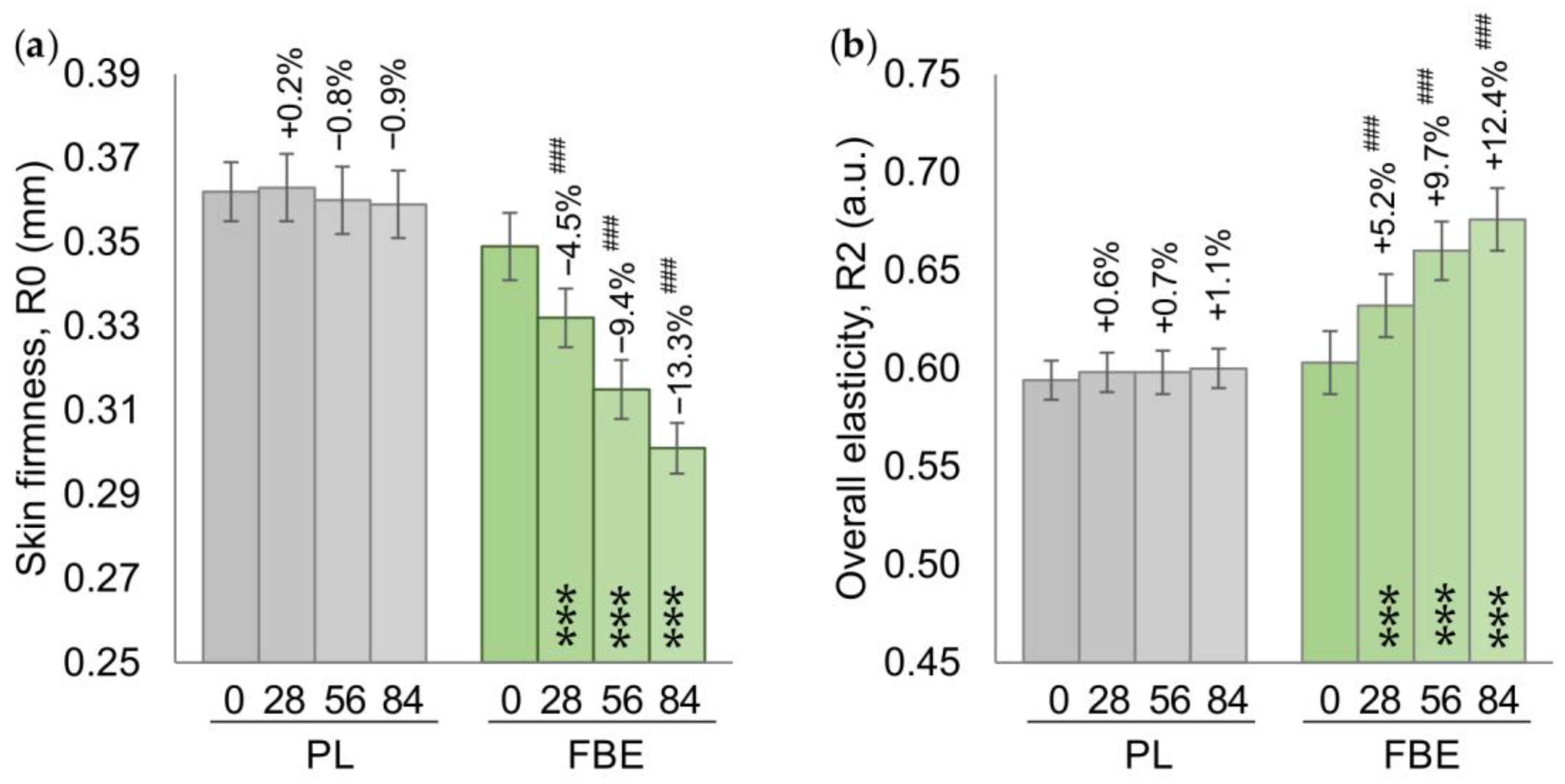 | Skin smoothness (Ra) | 34.9 ± 1.2 | 34.5 ± 1.2 | μm |