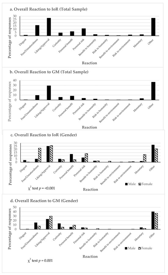 The frequency of these response types is illustrated in Figure 1, which comprises seven charts. The first two charts (Figure 1a,b) present the overall frequency of responses from both replications (R1 and R2) for IoR and GMOs, in which IoR shows a higher frequency of fear/unnaturalness and personal risk. The subsequent two charts (Figure 1c,d) break down the frequency based on gender. Conducting a Chi2 analysis to assess the significance of any variations in gender-related responses revealed no statistical significance. Figure 1e,f show the relative frequency of the groups for the initial response compared to the subsequent three of the four permitted responses. The relative frequency of the response type within the initial term provided by respondents in reaction to the IoR and GMO concept was then compared with the subsequent three responses they offered to determine if any “immediacy effect” could be identified. Although the Chi2 analysis indicated no significance, the histogram in Figure 1e,f shows a tendency for a higher proportion of non-cognitive/affective reactions in the initial response (reflecting heightened levels of fear/unnaturalness and liking/approval), except for the cognitive reaction related to IoR, specifically the personal risk aspect, which exhibits an increased frequency of responses.