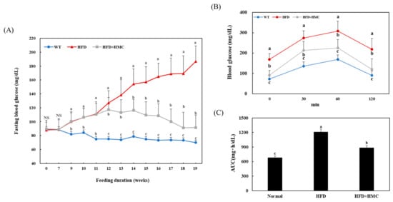 HMC improves high blood glucose in mice fed a high-fat diet. Normal group: C57BL/6J wild-type mice (n = 8) fed a normal chow diet; HFD group: C57BL/6J wild-type mice (n = 8) fed a high-fat diet; HFD + HMC group: C57BL/6J wild-type mice (n = 8) fed a high-fat diet and HM-chromanone 50 mg/kg body weight. (A) Fasting blood glucose level. (B) Oral glucose tolerance test level. (C) Area under the curve level. Each value is expressed as the mean ± SDE (n = 8). NS: not significant. a–c Values with different superscript letters are significantly different (a: p < 0.05, b: p < 0.01, c: p < 0.001) based on Bonferroni’s contrast test when using two-way ANOVA.
