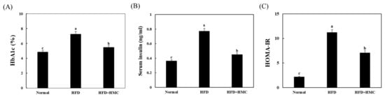 The effect of HMC on HbA1c, serum insulin, and HOMA-IR levels in HFD-fed mice is depicted in Figure 2. The HbA1c level of the HFD group (7.25 ± 1.81%) was significantly higher than that of the control group (4.83 ± 0.52%). In the group receiving HMC supplementation, an HbA1c level of 5.46 ± 0.67% was significantly lower than that of the HFD group.