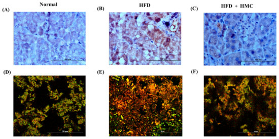 The effect of HMC on the function of pancreatic β cells in mice fed on an HFD is shown in Figure 3. The immunohistochemical analysis recorded more insulin in the HFD group than in the control group. In contrast, the HMC-supplemented group showed significantly lower insulin levels than the HFD group. In the double immunofluorescence assay, more insulin was once again observed in the HFD group than in the normal group, and the insulin levels were once again lower in the HMC-supplemented group than in the HFD group.