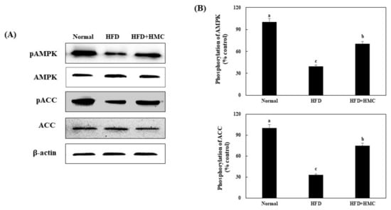 The effects of HMC on pAMPK and pACC expression were investigated in the skeletal muscles of HFD-fed mice (Figure 4). Compared to the expression of pAMPK and pACC in the control group (100% for both), that in the HFD group was significantly decreased to 39.61% and 33.00%, respectively. On the other hand, HMC supplementation significantly increased the expression of pAMPK and pACC compared to that in the HFD group, reaching 70.23% and 75.00%, respectively. Collectively, these results indicated that HMC activated AMPK in the skeletal muscles of HFD-fed mice.