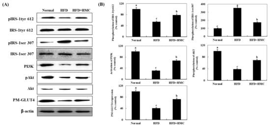 We investigated the effect of HMC on the expression of pIRS-1tyr612, pIRS-1ser307, PI3K, and pAKT, which are transcription factors involved in insulin signaling in the skeletal muscle of mice (Figure 5). The expression of pIRS-1tyr612 decreased from 100% in the control group to 53.69% in the HFD group. On the other hand, its expression in the HMC-supplemented group was significantly higher than that in the HFD group, at 78.25%. The expression of pIRS-1ser307 increased from 100% in the control group to 353.05% in the HFD group, compared with which a significantly decreased expression of 174.31% was recorded for the HMC-supplemented group. Similarly, the expression of PI3K, pAkt, and PM-GLUT4 decreased significantly from 100% for all in the control group to 31.27%, 38.12%, and 41.00%, respectively, in the HFD group; however, corresponding expression in the HMC-supplemented group showed significant increases of 67.35%, 69.00%, and 72.68%, respectively, compared to those in the HFD group.