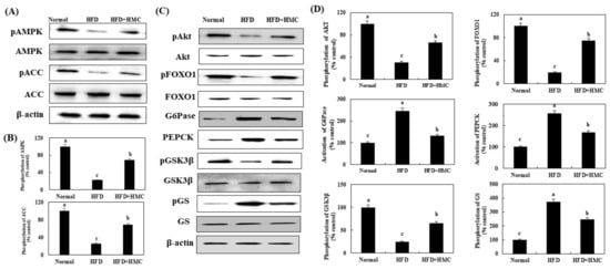 HMC improves AMPK and Akt/FOXO1 pathway in the liver of mice fed a high-fat diet. Normal group: C57BL/6J wild-type mice (n = 8) fed a normal chow diet; HFD group: C57BL/6J wild-type mice (n = 8) fed a high-fat diet; HFD + HMC group: C57BL/6J wild-type mice (n = 8) fed a high-fat diet and HM-chromanone 50 mg/kg body weight. (A) pAMPK, AMPK, pACC, and ACC expression. (B) Expression levels of pAMPK, AMPK, pACC, ACC. (C) pAkt, Akt, pFOXO1, FOXO1, G6Pase, PEPCK, pGSK3β, GSK3β, pGS, and GS expression. (D) Expression levels of pAkt, pFOXO1, G6Pase, PEPCK, pGSK3β, and pGS. Each value is expressed as the mean ± SDE (n = 8). a–c Values with different superscript letters are significantly different (a: p < 0.05, b: p < 0.01, c: p < 0.001) based on Bonferroni’s contrast test when using two-way ANOVA.