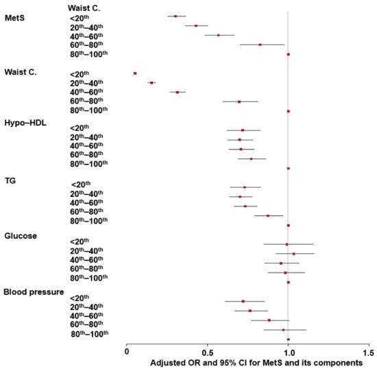 Adjusted odds ratios (red square) and 95% confidence intervals (line) for metabolic syndrome and its components based on waist circumference (WC) changes. Waist circumferences were divided into five groups by quintiles, and the highest group (80th–100th percentile) was used as the reference group in a logistic regression adjusting for covariates, including age, residence region, education, income, follow-up duration, energy intake, drinking status, smoking status, and exercise. MetS, metabolic syndrome; C., circumference; TG, triglyceride.
