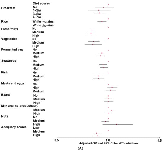 The MHEI is composed of the adequacy, moderation, and balance components of nutrient and food intake. There were gender differences in all MHEI scores except for energy, saturated fat, and fast foods (Table 3). The components of the adequacy scores, except for the scores of meats and eggs, milk and its products, and nuts, were significantly higher in the WC-loss than the WC-gain groups, suggesting that participants with a higher adequacy score showed a greater decrease in WC than those with a lower score (Table 3). Moreover, the total adequacy score was higher in the WC-loss group than in the WC-gain group. The total adequacy score was inversely associated with WC change, with WC gain as the reference (Figure 3A). For the adequacy components, a regular breakfast with grains and a higher intake of vegetables, fermented vegetables, fruits, seaweeds, and fish were inversely associated with WC gain. Therefore, participants consuming an adequate intake of healthy foods showed decreased WC. The overall moderation score was higher in the WC-loss group than in the WC-gain group. Only the moderation scores for fast food and noodles affected WC, with higher intakes in the WC-gain group than in the WC-loss group (Table 3). Among the moderation score components, the scores for carbohydrates, polyunsaturated fatty acids (PUFA), noodles, fast foods, and sodium were inversely associated with WC reduction (Figure 3B). Therefore, a lower intake of fast foods and noodles was associated with greater decreases in WC.