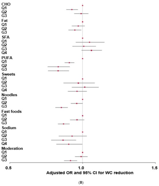 Odds ratios (red square) and 95% confidence intervals (line) for the modified healthy eating index (MHEI) based on waist circumference (WC) reduction after adjusting for covariates including age, residence region, education, income, follow-up duration, energy intake, drinking status, smoking status, and exercise. (A) Adequacy scores; (B) moderation scores; (C) balance scores and total MHEI scores. CHO, carbohydrate intake; SFA, saturated fatty acids; PUFA, polyunsaturated fatty acids. Q1, Q2, Q3: tertiles.