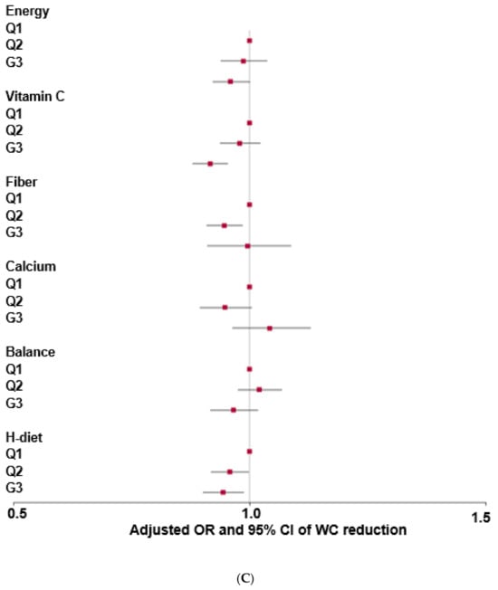 The Mediterranean diet, a healthy eating pattern characterized by a plant-based diet that is high in unsaturated fat and lowers the risk of chronic metabolic diseases, has received significant attention. Studies such as the Prevention with Mediterranean Diet (PREDIMED) trial have demonstrated better outcomes regarding cardiovascular and other chronic diseases in individuals at high cardiovascular risk who are on the Mediterranean diet []. However, adaptability, sustainability, and compliance related to specific diets, such as the Dietary Approaches to Stop Hypertension (DASH) and Mediterranean diets, for reducing abdominal obesity in regions like Asia pose challenges. This highlights the need to explore region-specific dietary patterns for sustained reductions in WC. Whereas cross-sectional studies have explored associations between WC and diets [,], only a few longitudinal studies have investigated the direct impact of dietary patterns or diet quality on reducing WC [].