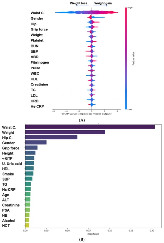 Statistical analyses were carried out using SAS version 9.3 (SAS Institute, Cary, NC, USA). Missing data were imputed with means for continuous variables and mode for categorical variables only in machine learning analysis. Other analyses were conducted using the available data. Descriptive statistics for categorical variables, such as gender, education, and smoking status, were examined by analyzing the frequency distributions within the WC-loss and WC-gain groups stratified by gender. Significant differences were evaluated using the Chi-squared test. For continuous variables, descriptive values, expressed as means and standard deviations, were delineated across the WC-loss and WC-gain groups and gender categories. Adjustments were made for age, education, income, residence area, follow-up time, daily energy intake, exercise, smoking status, and alcohol consumption. The differences were assessed using a two-way analysis of variance (ANOVA) with an interaction term to accommodate covariate adjustments, including age, residence region, education, income, follow-up duration, energy intake, drinking status, smoking status, and exercise. Subsequently, post-multiple comparisons among the gender and WC-loss groups were executed using Tukey’s test. Adjusted odds ratios (OR) and 95% confidence intervals (CI) were computed for the highest WC-gain group as the reference. The covariates included age, residence region, education, income, follow-up duration, daily energy intake, drinking status, smoking status, and exercise. The statistical approach enabled a thorough examination of associations while accounting for relevant covariates.