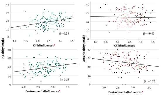 Separate multiple linear regression analyses were conducted to predict dietary intake scores (healthy and less healthy) from the RF scores (environmental influences and child influences) while adjusting for the child’s age, history of breastfeeding, and household food insecurity. Bivariate associations between the RF factors and the children’s dietary intake are shown in Figure 2. Higher environmental influences scores were associated with lower scores for less healthy intake (β = −0.22, p < 0.01) and separate from significant effects of greater age (β = 0.32, p < 0.01), and non-significant effects of breastfeeding (β = −0.06, p = 0.47) and food insecurity (β = 0.06, p = 0.51). In addition, higher environmental influences scores were associated with higher scores for healthy intake (β = 0.35, p < 0.01) and separate from significant effects of breastfeeding (β = 0.23, p < 0.01), and non-significant effects of the child’s age (β = −0.10, p = 0.26) and food insecurity (β = 0.15, p = 0.08) Higher child influences scores were associated with higher scores for healthy intake (β = 0.28, p < 0.01) and separate from significant effects of breastfeeding (β = 0.18, p < 0.05) and non-significant effects of the child’s age (β = −0.06, p = 0.51) and food insecurity (β = 0.09, p = 0.29). There was a flat relationship between the child influences score and less healthy intake score (β = −0.03, p = 0.98) with significant effects of greater age on high scores for less healthy intake (β = 0.30, p < 0.01) and additional non-significant effects of breastfeeding (β = −0.05, p = 0.52) and food insecurity (β = 0.12, p = 0.19).